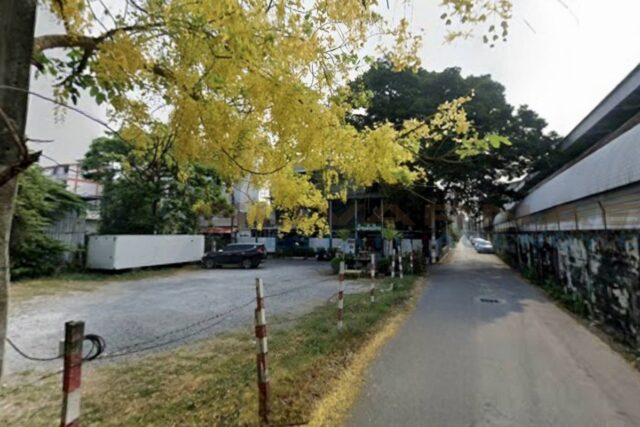 ที่ดินถมแล้ว เป็นพื้นคอนกรีต ที่ดินติดถนน 2 ด้าน ( ถนนซอยลาดยาง ) พื้นที่สีเหลือง