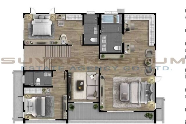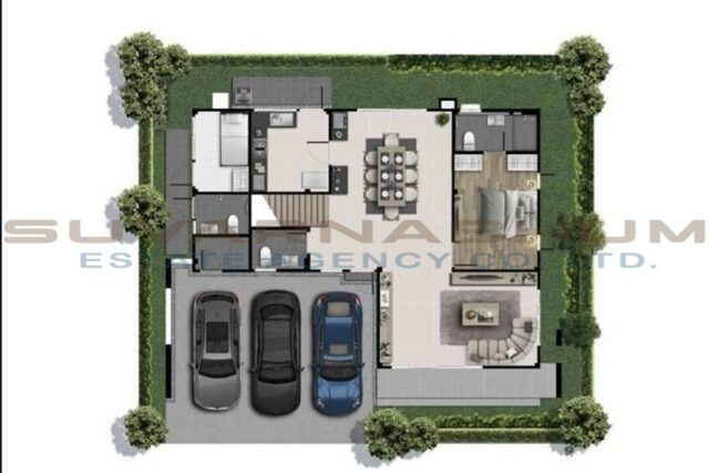 3-4 ห้องนอน 3-5 ห้องน้ำ 1 ห้องนั่งเล่น 1 ห้องทำงาน 1 ห้องครัว 1 ห้องแม่บ้าน ที่จอดรถ 2-4 คัน