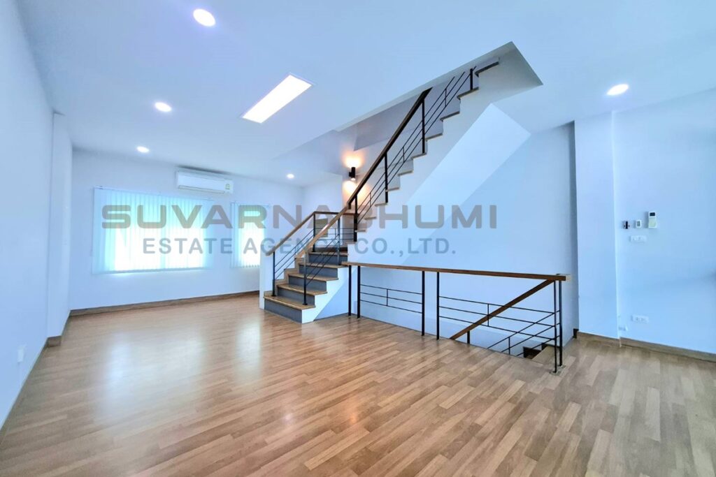 วัสดุปูพื้นชั้นล่างแกรนิตโต้ วัสดุปูพื้นชั้นบนลามิเนต หน้าบ้านหันไปทิศเหนือ